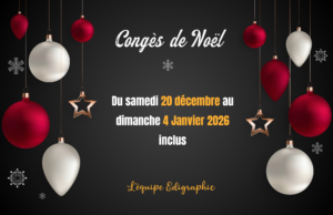 Votre imprimerie IGE Edigraphic tient à vous informer qu'elle sera fermée pour les Fêtes de fin d'année 2025 du : Vendredi 19 décembre 2025 à 12H jusqu'au Lundi 5 Janvier 2026 Veuillez vous y prendre à l'avance pour des demandes éventuelles d'impression afin d'être livré dans les temps... Pour plus d'informations, n'hésitez pas à nous contacter au 05 45 85 35 67 ou par mail edigraphic16@orange.fr.